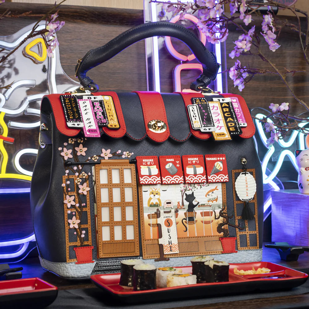 If you loved it in grey, you’re going to roll over this new colourway! The Vendula Sushi – Blue Edition Grace Bag is an everyday staple crafted from vegan leather, featuring a roomy compartment and multiple pockets tucked beneath a charming black and red awning-style flap. It’s designed with both a comfortable handle and a detachable strap for versatility, plus base studs to keep it clean and stable. Adorned with neon-style signage, a lifting door, and our beloved furry chefs, this bag invites you into a vibrant sushi spot that’s full of life—and flavour. Eat in or takeaway?