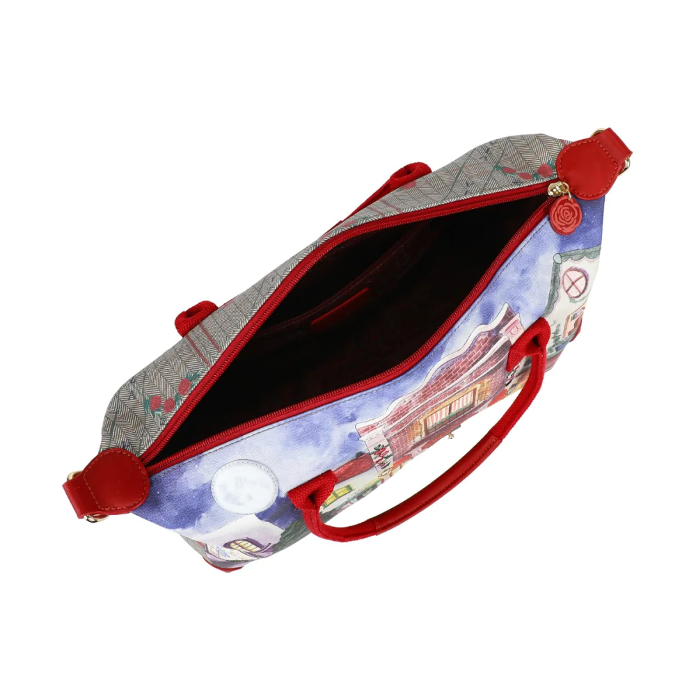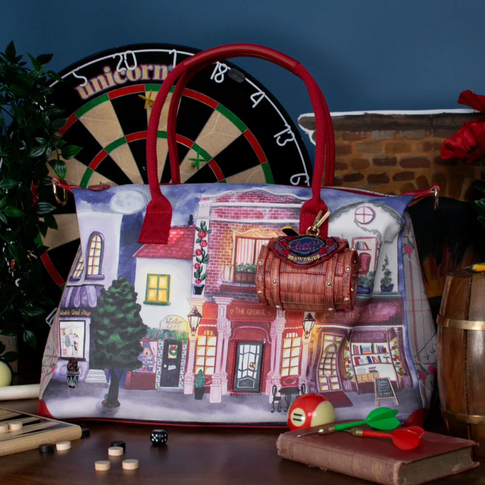 Good evening, and welcome to the coolest street in Vendula Town! The Cheers Street Bonnie Weekender Bag features some of our favourite Vendula storefronts—can you spot your go-to? This spacious, soft vegan leather bag is large enough to fit all your essentials, including a laptop or tablet, and has multiple pockets to keep things organised. Carry it over the shoulder or crossbody, using the sturdy handles or the wide, adjustable strap for all-day comfort. Adorned with a hand-drawn, colourful design and detailed with handstitched potted roses, this bag is a perfect match for the season. Ready to paint the town red with this stunner on your arm