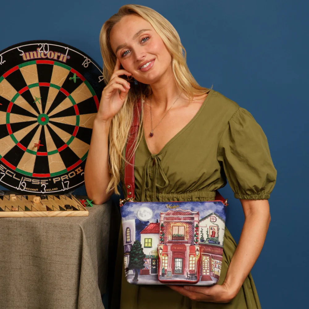 Feeling the autumn blues? The Cheers Street Pippa Bag is here to lift your spirits! Made from vegan leather, this chic shoulder bag is perfect for both everyday use and special occasions. It offers a roomy main compartment with plenty of inner and outer pockets to keep your essentials in order. Carry it as a handbag or wear it over the shoulder using the glamorous gold-studded strap. The hand-illustrated Cheers Street artwork, paired with a signature Vendula-printed lining, will bring a touch of class and originality to your seasonal style. Don’t miss out on this beauty
