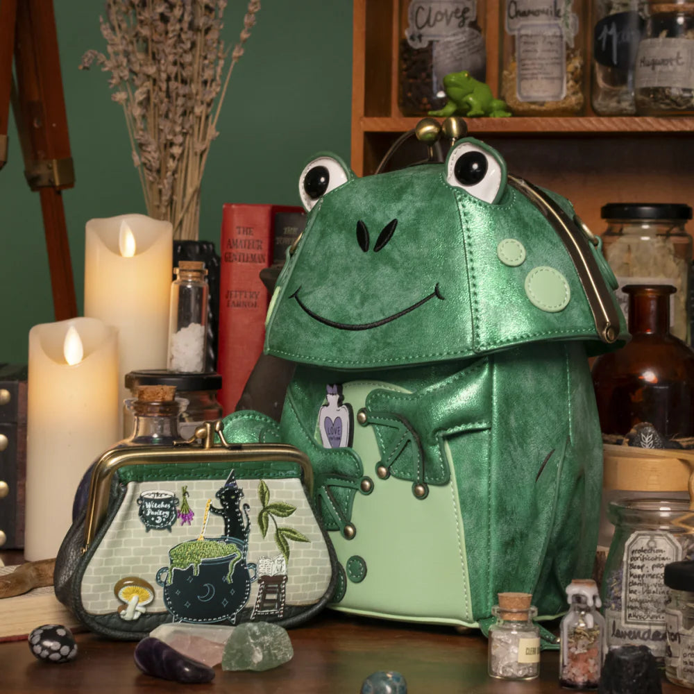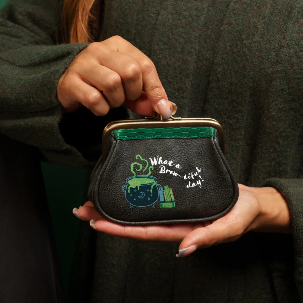 On a scale of 1 to 10, your excitement for the Witches Pantry Clipper Coin Purse is probably an 11! This dual-compartment coin purse keeps your cash and cards secure under a clasp closure. Made from vegan leather and adorned with witchy art, it’s the perfect partner to your Witches Pantry bag. Just don’t be surprised if your envious friends start turning green… frog spell, anyone?